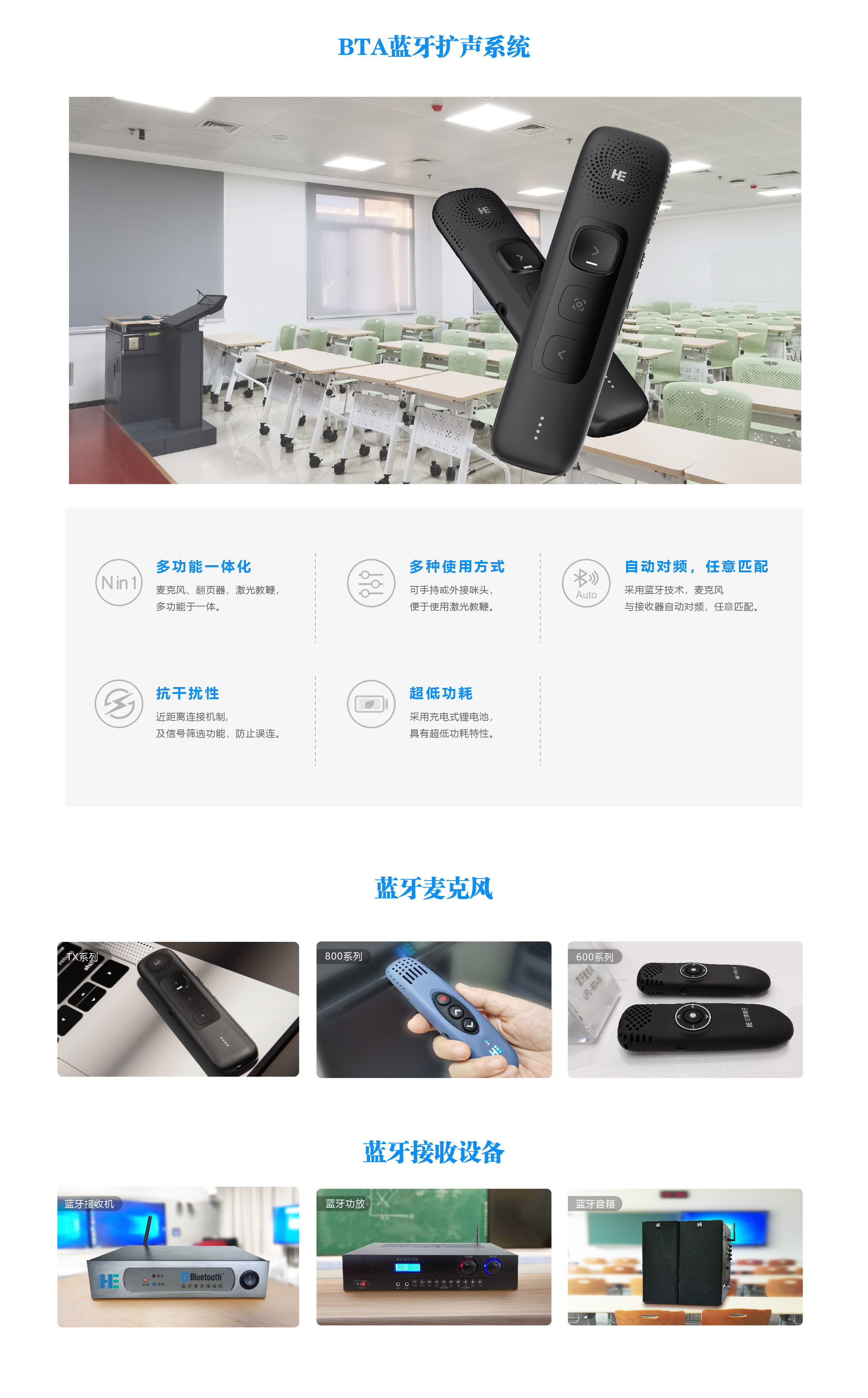 BTA藍(lán)牙擴(kuò)聲系統(tǒng),采用國際通用、標(biāo)準(zhǔn)的藍(lán)牙通訊協(xié)議,具有自動對頻、任意匹配的特性,可以實現(xiàn)“一師一麥”的應(yīng)用模式,免借還、免管理,專用衛(wèi)生。系統(tǒng)性能穩(wěn)定、抗干擾能力強,可實現(xiàn)走下講臺授課的需求。除本地擴(kuò)聲以外,還可為線上教學(xué)提極佳的音質(zhì)效果,滿足各種教學(xué)場景使用需求。