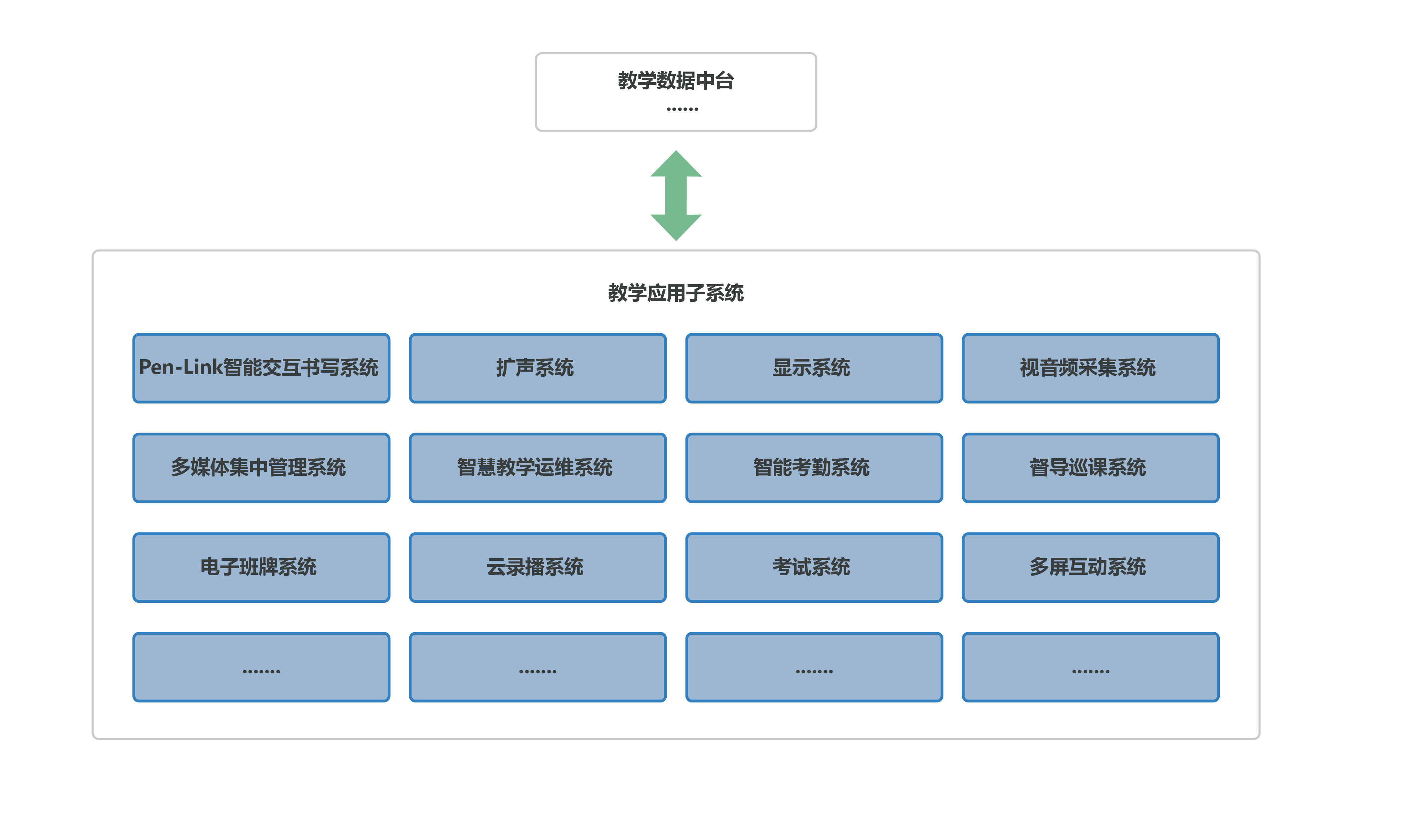 各教學(xué)應(yīng)用子系統(tǒng)深度有機(jī)融合,全局管控,既避免系統(tǒng)林立,又確保其整體性、實(shí)用性、便利性。
