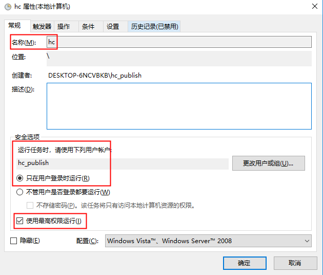 4、輸入一個名稱,并勾上使用最高權限運行。如下圖:(注:用戶賬戶必須為本機登錄賬戶)